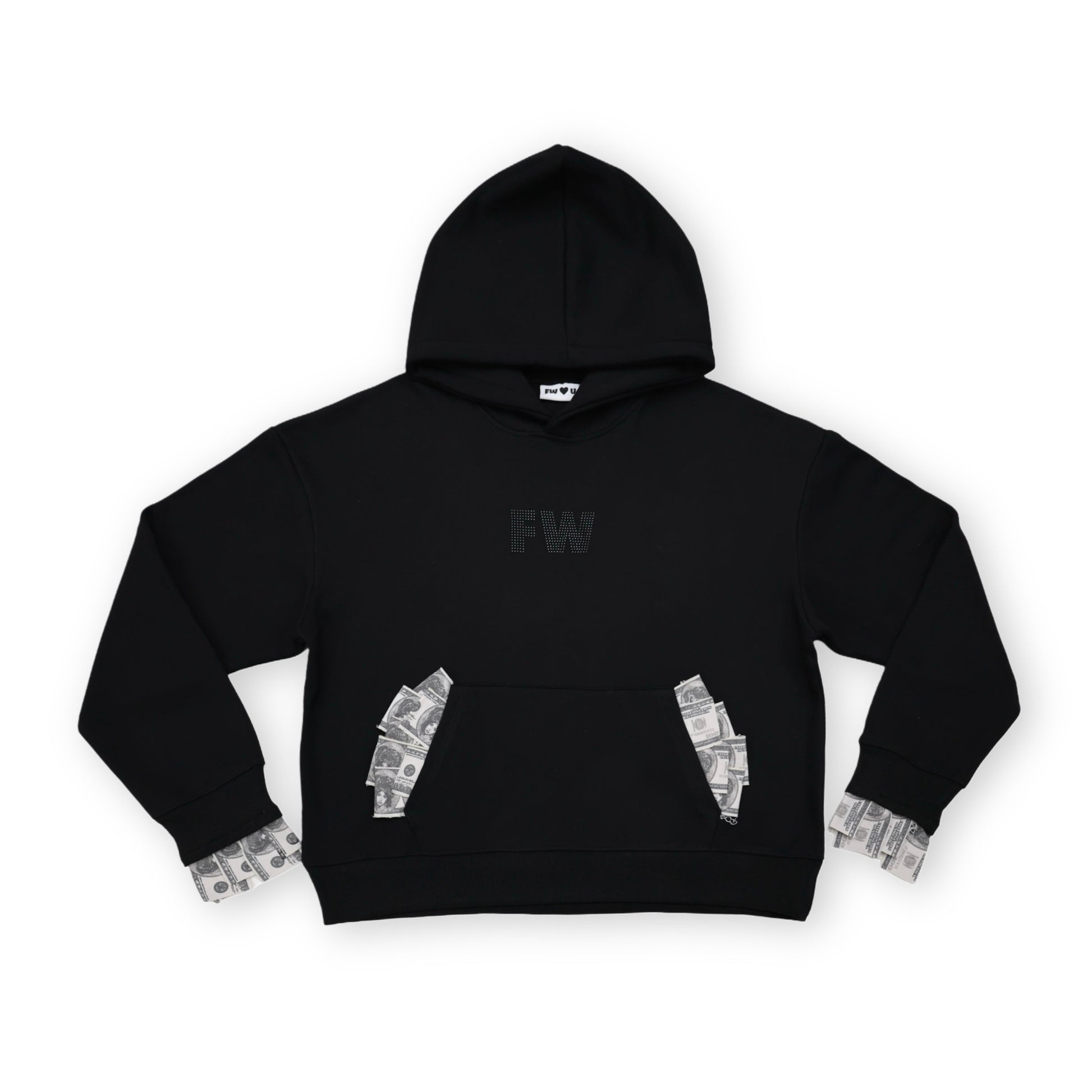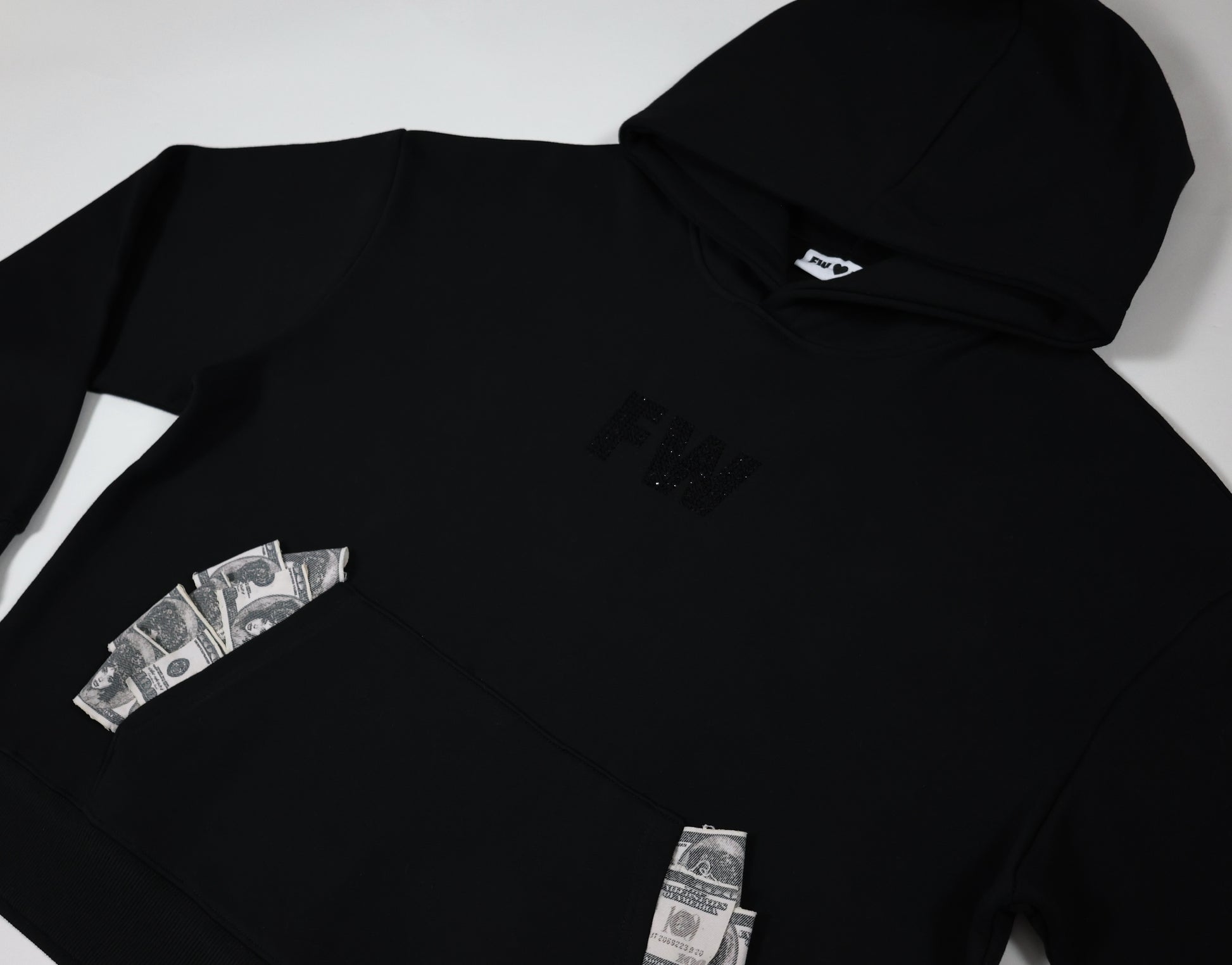 Cozy meets statement. This black hoodie features subtle rhinestone detailing that adds a touch of shine to your everyday look.